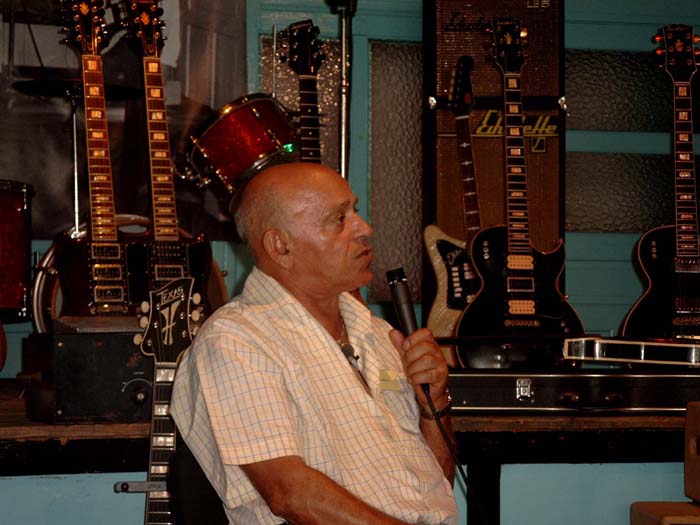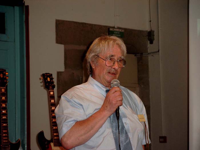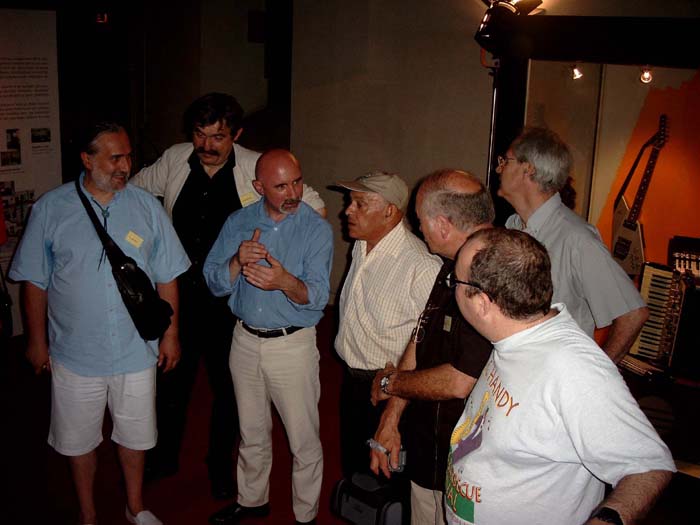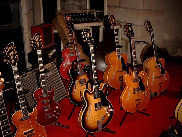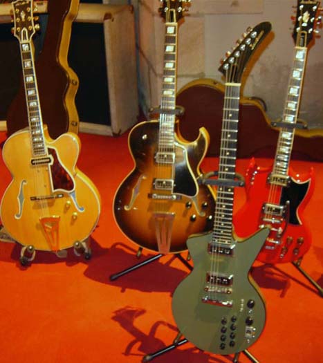 Compte rendu de la journée Jacobacci du 25 juin 2005 à Montluçon. Roger et Charlotte Jacobacci étaient arrivés la veille de Fontenay le Comte. Les premiers participants arrivent au musée aux alentours de 10H. Le repas de midi réunis tous les présents au restaurant La Crémaillère, autour de Roger et Charlotte et de Pierre Cullaz et son épouse. Raymond Gimenes nous rejoint à la fin du repas. Les invités regagnent le Château des Ducs de Bourbon. Leurs guitares sont installées pour y être exposées dans l’une des salles du musée, les guitares appartenant aux collections du musée étant pour leur part regroupées sur le « parquet de bal » dans la salle où doit se tenir la conférence.