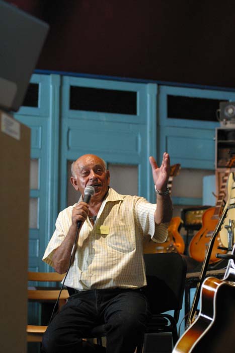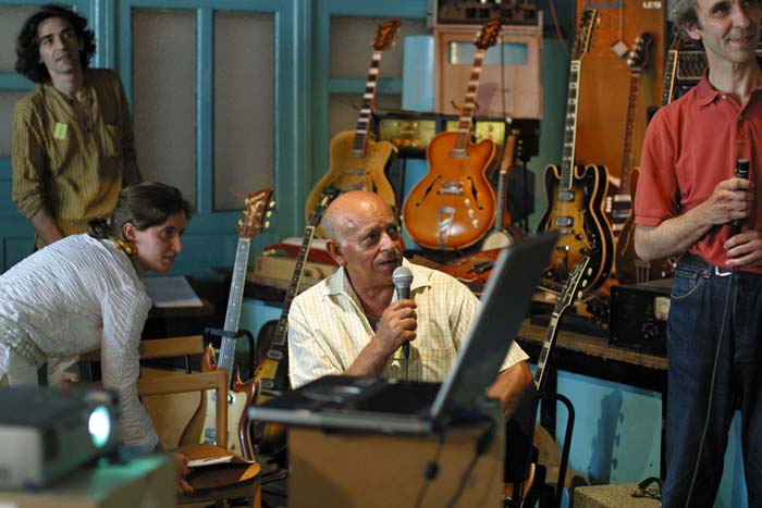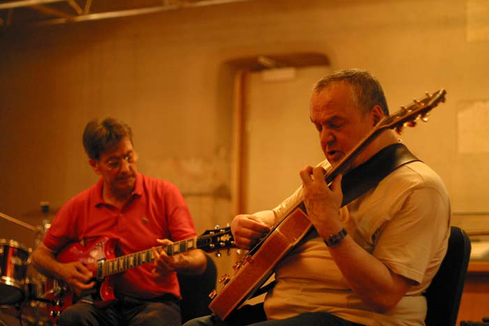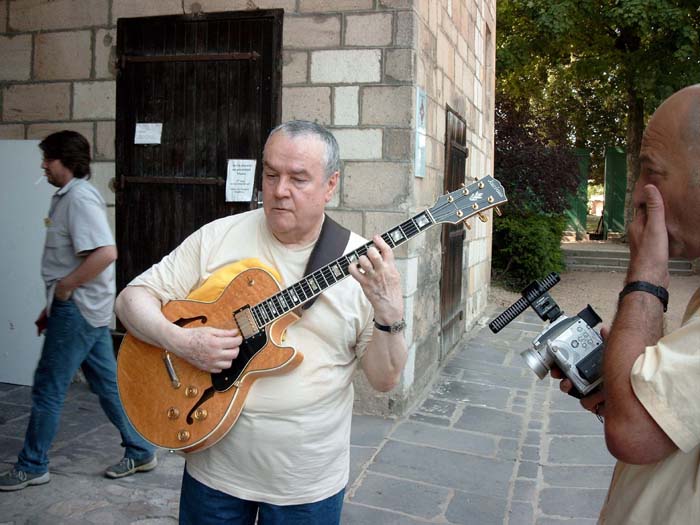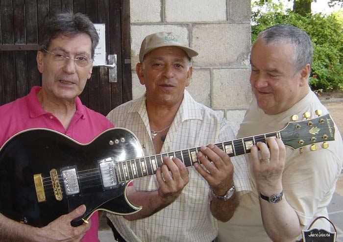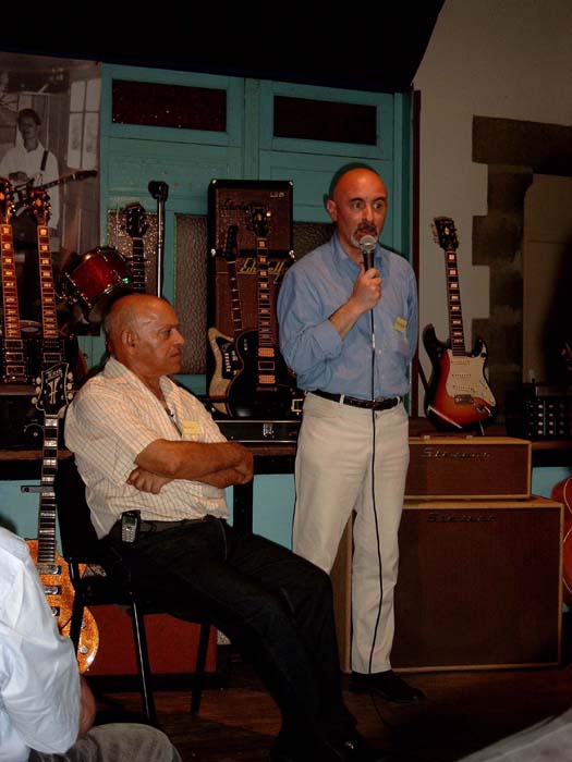 de gauche à droite - left to right : Klaus Blasquiz, Jean-Michel Renard, Eric Bourgougnon, Roger Jacobacci, Jean-Claude Bompais, William Varrall, Jean Debèze - Photo Nathalie Varrall A la demande de Marc Touché, Raymond Gimenes et Pierre Cullaz interprètent en duo cinq morceaux sur des guitares Jacobacci pour Roger et un public visiblement ravis. On Marc Touché request, Raymond Gimenes and Pierre Cullaz performed a duet of five pieces on Jacobacci guitars for Roger and the audience, both of them obviously delighted Out of nowhere (Grenn - Heyman) par Raymond Gimenes et Pierre Cullaz (enregistrement William Varrall) Raymond Gimenes et Pierre Cullaz - Photo Arnaud Lavergne, musée de Montluçon La conférence commence à 17H après une visite de l’exposition en cours au musée : « Complément d’objets ». Après une introduction de la conférence et un hommage à Roger Jacobacci par Mme Evelyne Tautou, adjointe à la culture de la Ville de Montluçon et par M. Eric Bourgougnon, conservateur du Musée des musiques populaires, Jean-Pierre Bourgeois annonce la création de l’association « Le projet Jacobacci » et Marie-Claire Lory le projet de publication d’un livre consacré à la famille Jacobacci en 2007. La conférence s’articule autour d’un diaporama retraçant d’une part l’histoire de la famille Jacobacci et présentant d’autre part les principaux modèles de la marque, animée par Marie-Claire et Marc Sabatier, Roger répondant à leurs questions et à celles des participant, avec des interventions de Mme Stéphane Brammer, Alain Kholer, Raymond Gimenes, Pierre Cullaz et Klaus Blasquiz. A la fin des débats, tout le monde se retrouve pour discuter autour d’un délicieux lunch servi sous les arcades du château jusqu’à 23H. The lecture started at 5 PM, after a tour of the current museum exhibition : "Compléments d'objets". After Mrs Evelyne Tautou (in charge of culture at Montluçon city council) and M. Eric Bourgougnon (curator of the Musée des musiques populaires de Montluçon) introduced the lecture and paid homage to Roger Jacobacci, Jean-Pierre Bourgeois announced the founding of the association "Le projet Jacobacci - Jacobacci Project" while Marie-Claire Lory disclosed that a book dedicated to the history of the Jacobacci family was to be released in 2007. The lecture was built upon a slide show, based both on the family history and on the brand most famous models, Roger answering questions asked by both Marie-Claire and Marc Sabatier, who leaded the lecture, but also by people in the audience, with speeches by Mrs Stéphane Brammer, Alain Kholer, Raymond Gimenes, Pierre Cullaz and Klaus Blasquiz. At the debates end, everyone joined together for an informal talk and a delicious buffet held under the castle arcades until 11 PM.