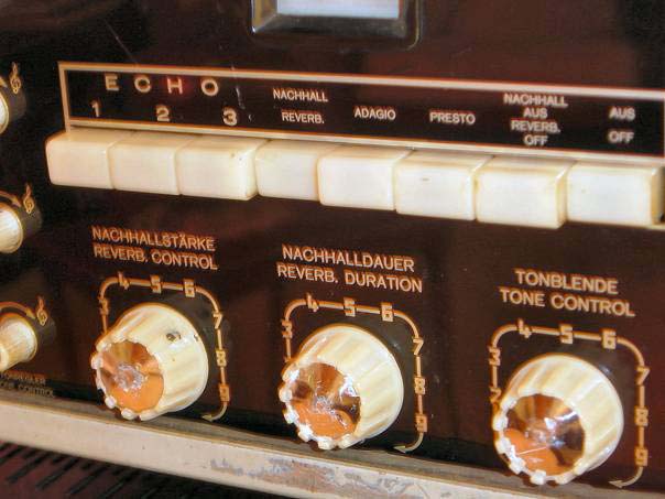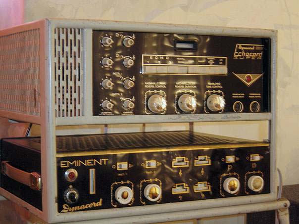 D’abord un ampli Dynacord Eminent : 45 vrais Watts, qui couvre sans problème les amplis à transistors de 100 watts d’aujourd’hui, grâce à une dynamique propre aux lampes et surtout une rondeur du son. Les lampes permettent des possibilités de graves extrêmement puissants sans altération des aigus, qui sont particulièrement brillants grâce à leur richesse en harmoniques. Pour les techniciens : 5 x ECC83, 2 x EL34, redresseur GZ34 et 1 x EM84, l’œil magique qui permet de surveiller la modulation. Au-dessus, la légendaire chambre d’écho Echocord 62 qui comporte trois entrées pour instruments (dont une sans effets) et deux entrées micros. Elle utilise 5 x ECC83, 1 x ECC82, et également un EM84 particulièrement utile pour assurer un réglage parfait de la modulation. Au point de vue réglage de l’écho, un clavier à touches éclairées permet de choisir entre l’écho avec trois réglages ou la réverbération. Le réglage peut être affiné en réglant, toujours par touches, la vitesse de la bande (22 ou 44 centimètres par seconde)