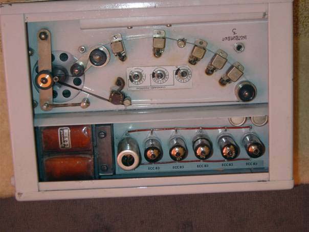 On voit ici les différents tubes cathodiques ainsi que la tête d’écriture-effacement en bas de cette photo et au-dessus les cinq têtes de lecture. La bande magnétique étant maintenu tendue par le système mécanique situé à gauche.