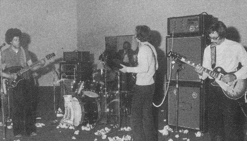 Intervalle (quatuor) - Salon de la musique 1973 : de G à D Patrice Cinélu (Ovation Breadwinner), Mino Cinélu drums, masqué par Gilles Douieb basse, RJ avec une Ibanez gaucher (l'étiquette du prix fixée à une mécanique !)