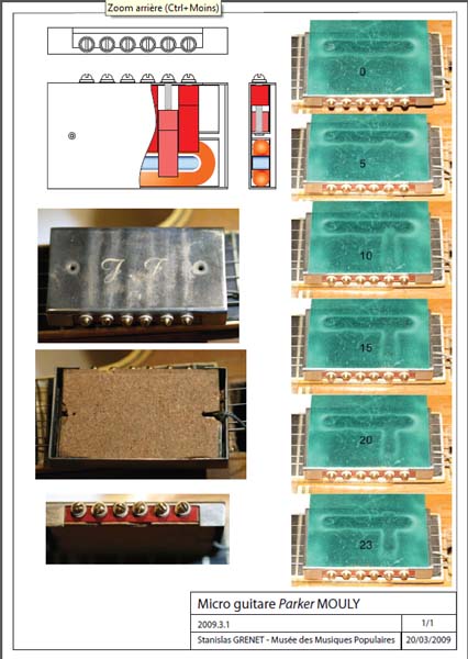 Schéma du micro JF. Le déplacement horizontal des masses polaires permet un réglage de tonalité pour chaque corde. Cliquez sur l'image pour le format .pdf, imprimable.