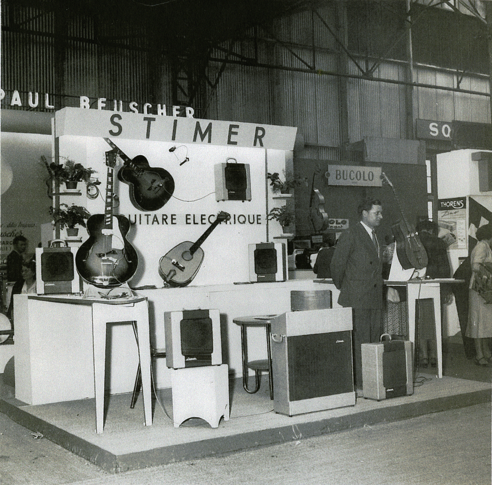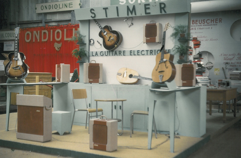 La guitare au premier plan à gauche est équipée des frettes "en éventail" du brevet déposé par P.M. Mouly la même année